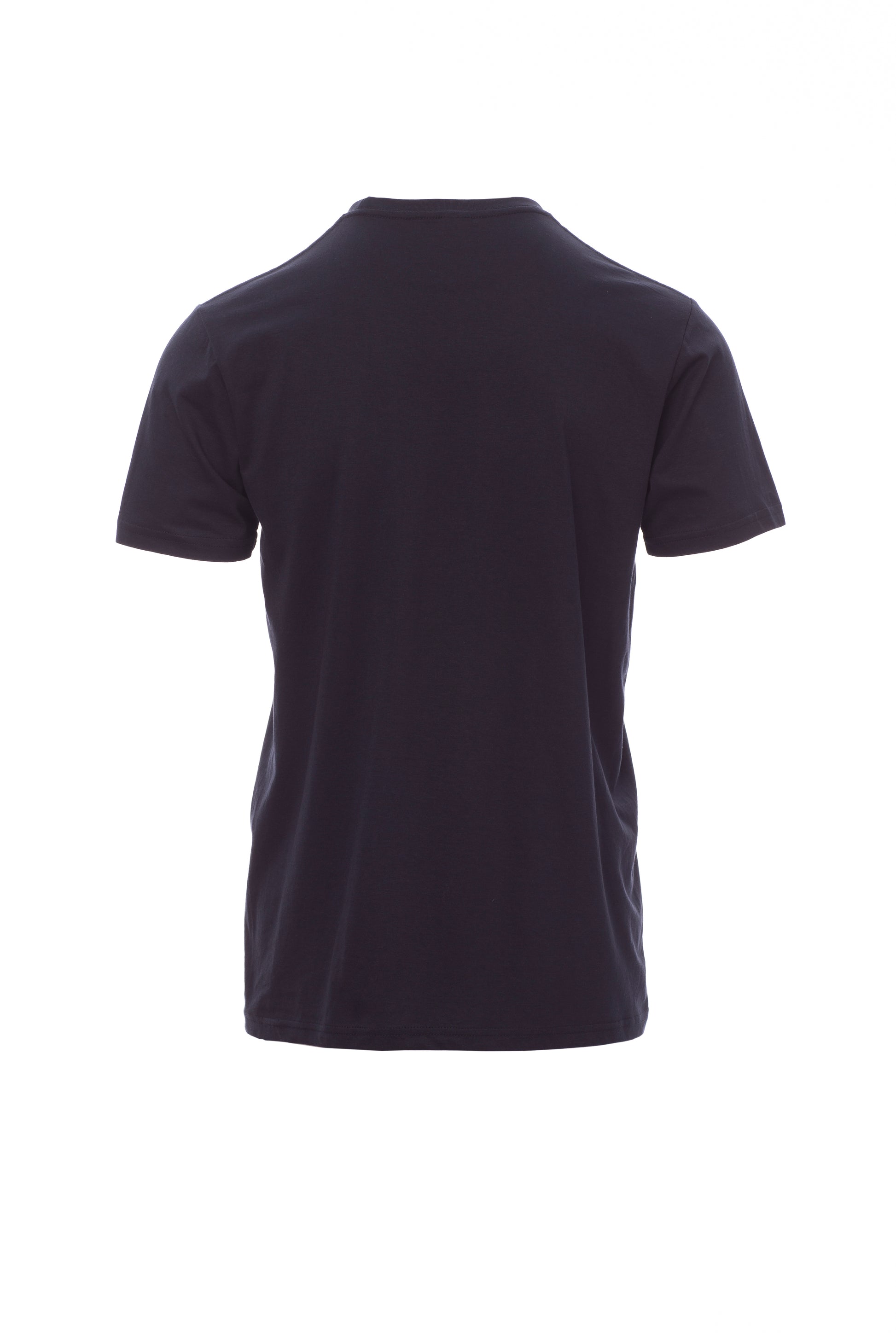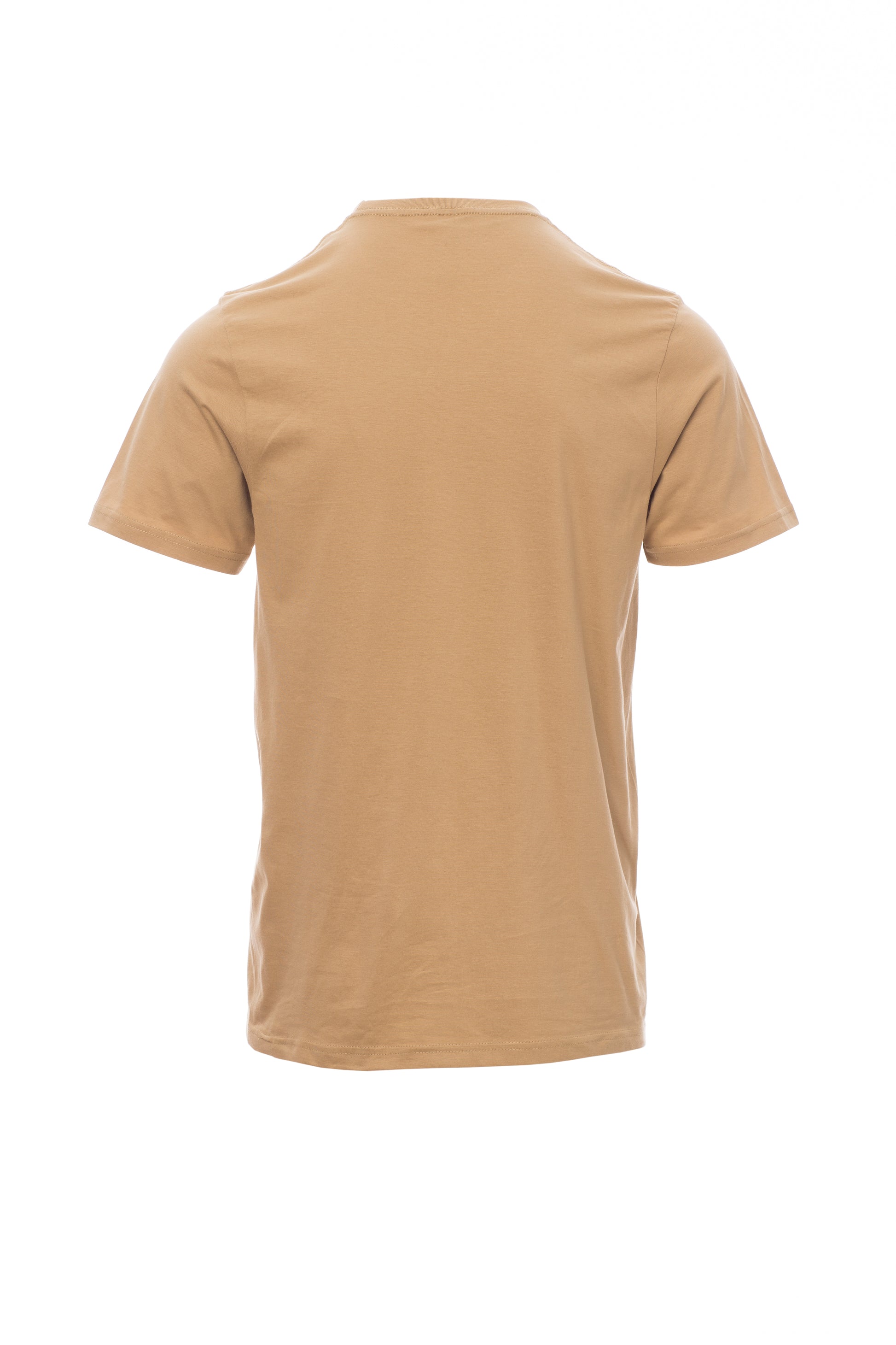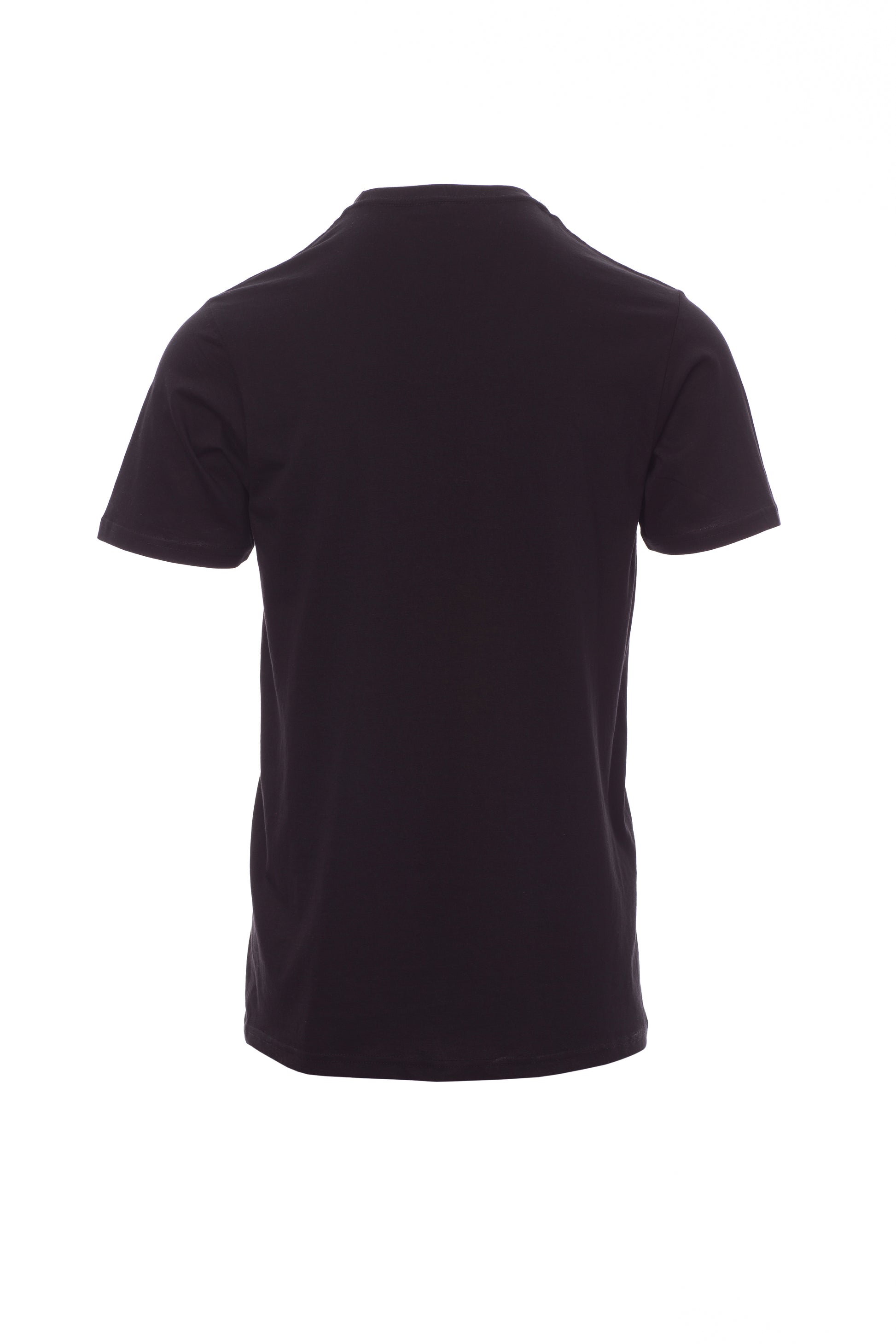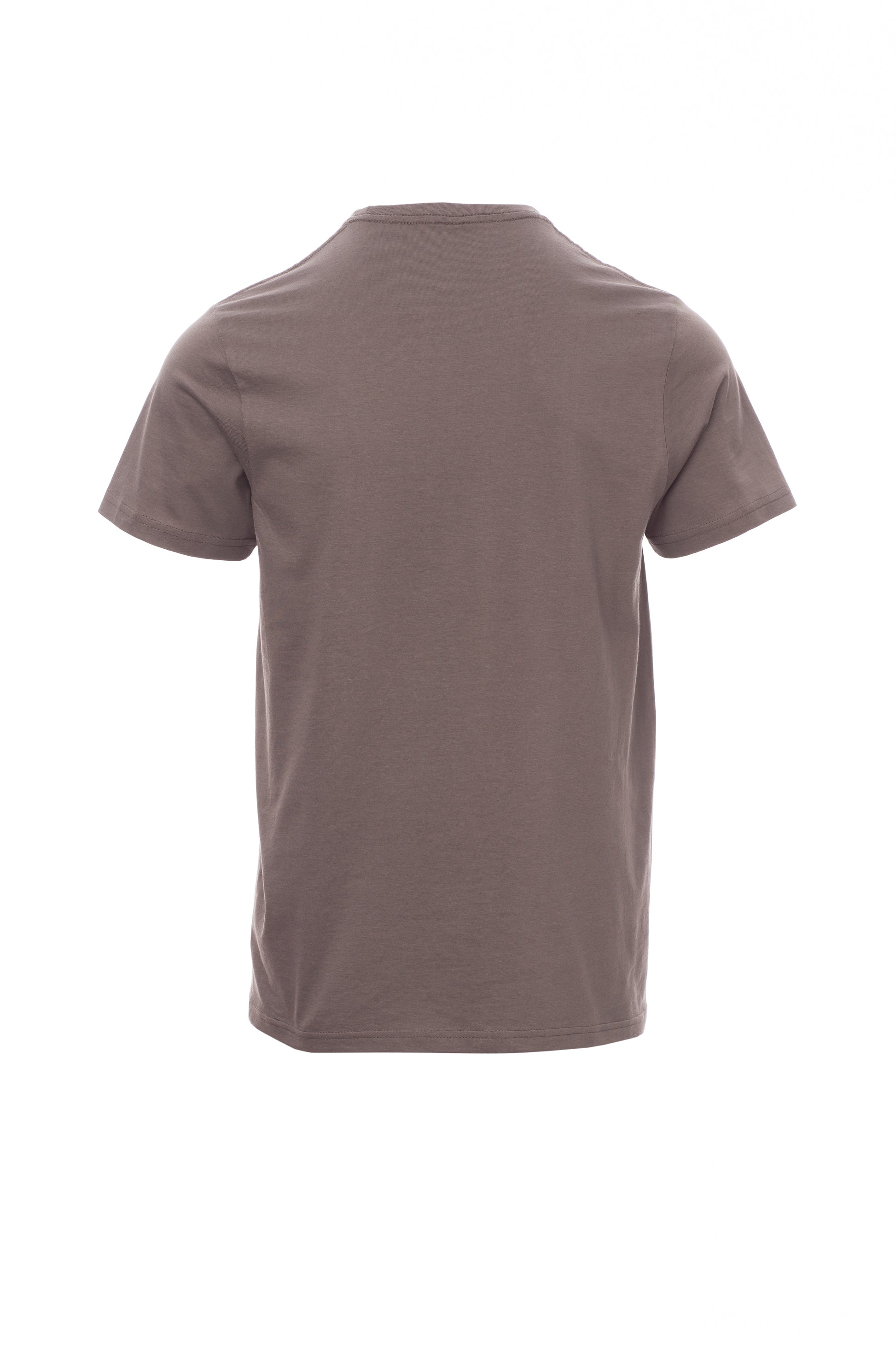 Kortærmet T-shirt med rund hals til mænd, med 1,5 cm spandex mix rib nakkebånd med kantsyning foran, kontrasterende skulder til skulder forstærkningsbånd synlig på indersiden af kraven, stræksømme, rørformet design.